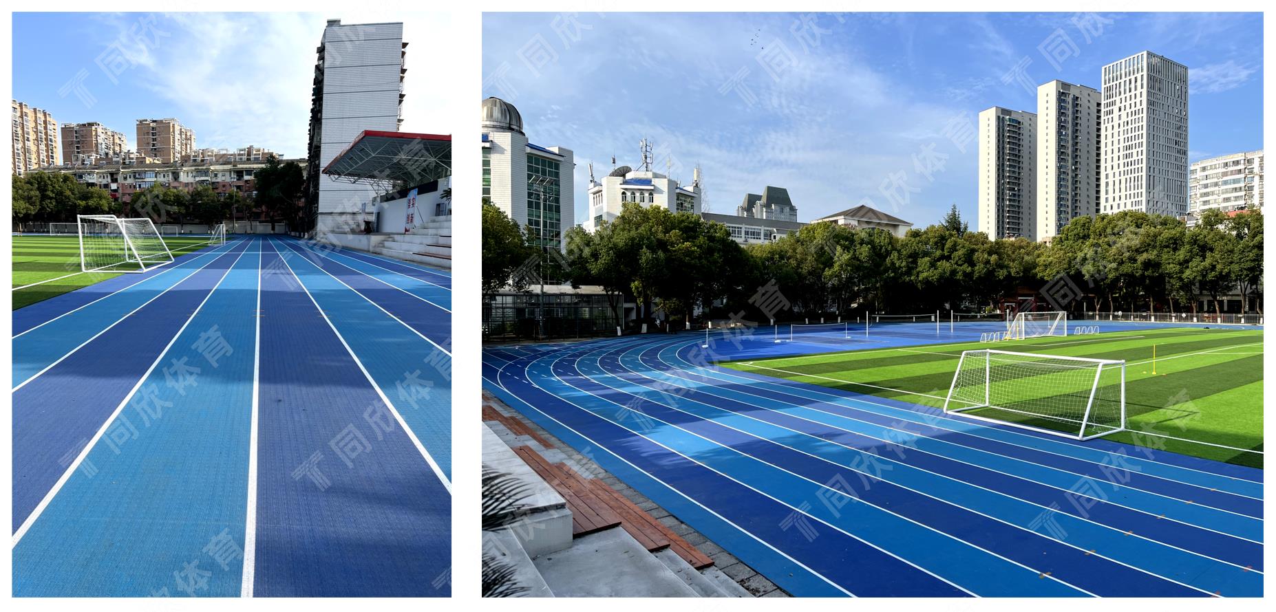 深淺藍(lán)色間隔的同欣跑道,綠色的草坪,白色的主席臺(tái),在炎炎夏日中顏值爆表!相信在運(yùn)動(dòng)性能和安全性能兼具的同欣跑道加持下,科高學(xué)子們將會(huì)跑得更快更遠(yuǎn)!