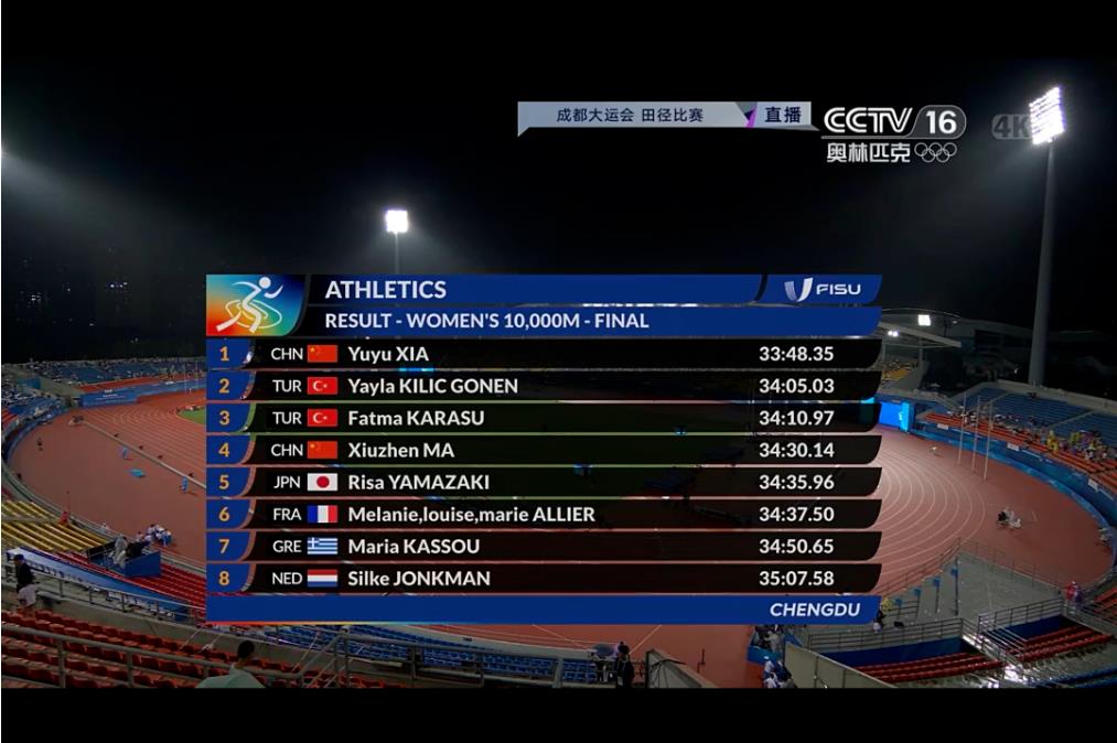 然后在女子10000米決賽中,中國選手夏雨雨33分48秒35獲得金牌!
