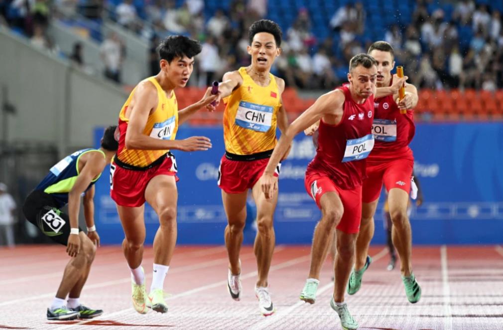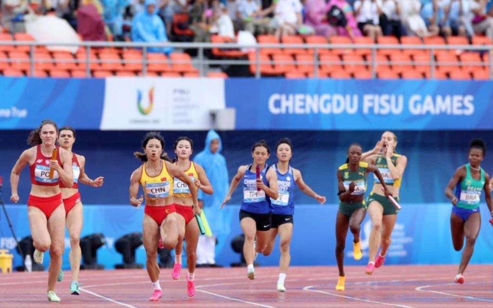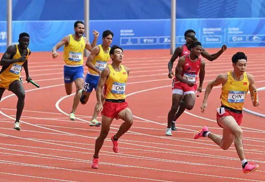 成都大運會男子4*100米接力決賽,中國隊陳佳鵬、陳冠鋒、嚴海濱、鄧智艦位于第四道。以38秒80的成績壓線絕殺獲得冠軍!這也是陳冠鋒和隊友們的第一個世界級賽事冠軍。