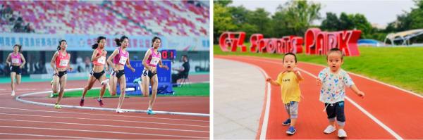 在廣州天河體育中心/廣州二沙島體育公園健身步道上奔跑的運動員和兒童