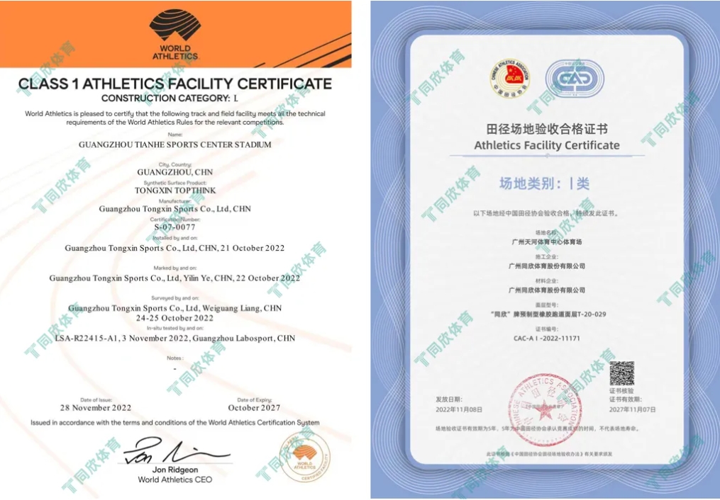 圖丨廣州天河體育中心-“雙一級(jí)”場地認(rèn)證證書